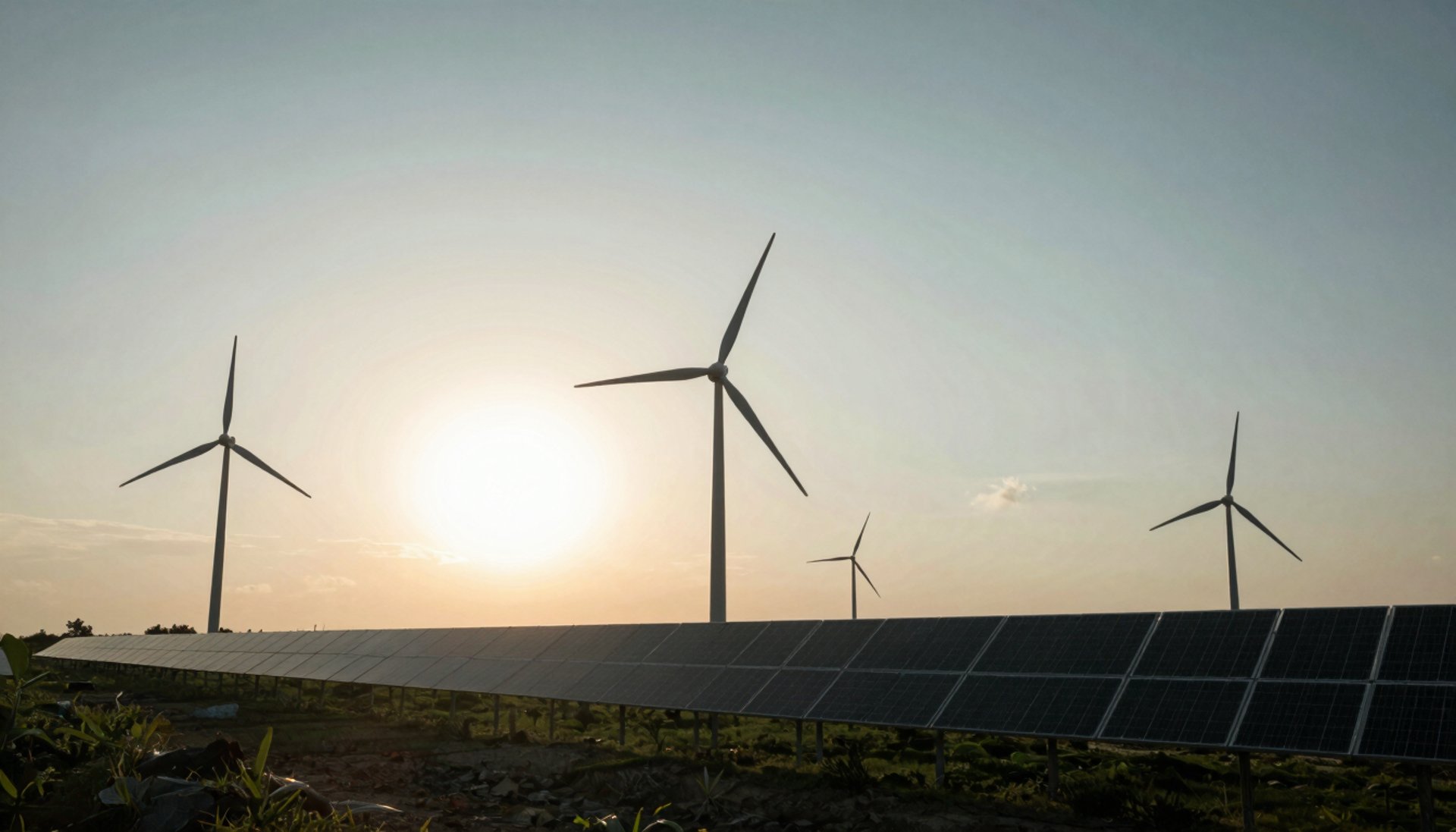 A cinematic shot of modern wind turbines standing tall against a pale off-white and soft sage green sky. The landscape is clean and well-maintained, representing sustainable and efficient energy production.